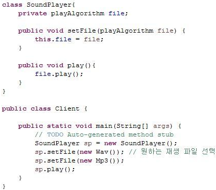 - → 변화하기 쉬운 것이란 구체적인 것(구체화된 클래스), 변화하기 어려운 것은 추상적인 것(추상 클래스 및 인터페이스)을 의미한다. DIP를 만족하면 '의존성 주입' 이라는 기술로 변화에 유연한 설계를 할 수 있다. 아래는 playAlgorithm라는 인터페이스의 의존성을 주입시킨 예시이다.