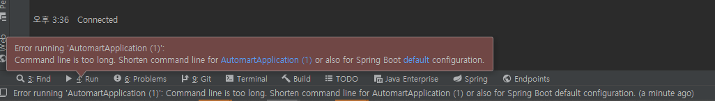 에러 : Command line is long. Shorten command line for xxxApplication or also for Spring Boot default configuration.